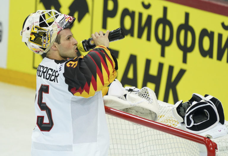 Nemecký brankár Mathias Niederberger počas štvrťfinálového zápasu na MS v hokeji 2021 proti Švajčiarsku. Riga, 3. jún 2021. Foto: SITA/AP