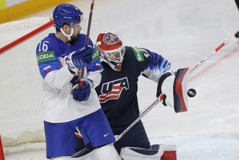Zákrok amerického brankára Cala Petersena po teči slovenského útočníka Róberta Lantošiho počas štvrťfinálového zápasu na MS v hokeji 2021. Riga, 3. jún 2021. Foto: SITA/AP.
