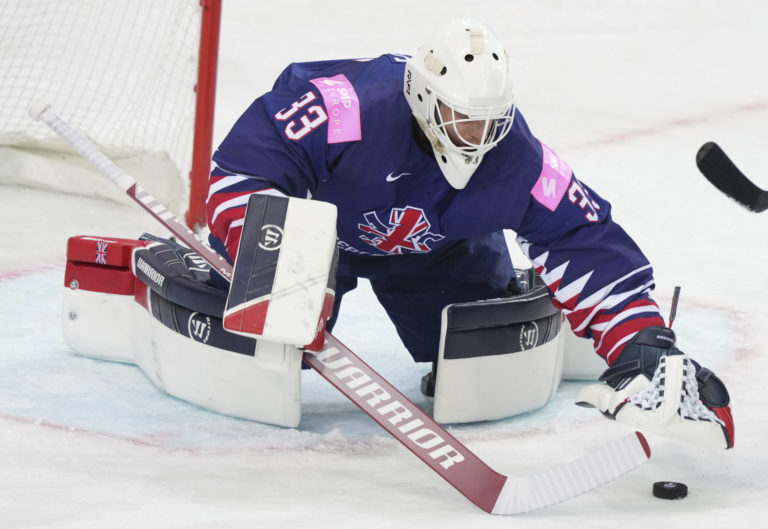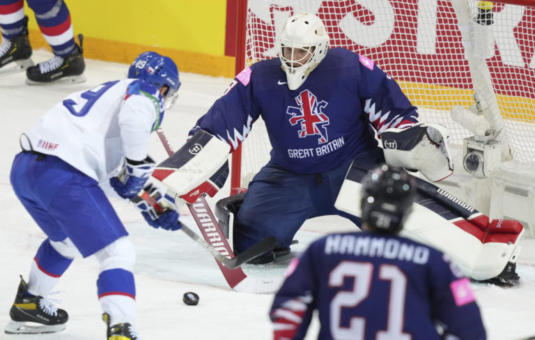 Zákrok britského gólmana Bena Bownsa počas zápasu proti Slovensku na MS v hokeji 2021. Riga, 23. máj 2021. Foto: SITA/AP.