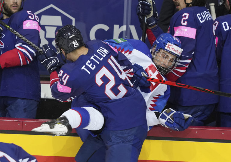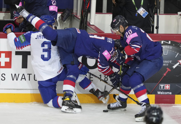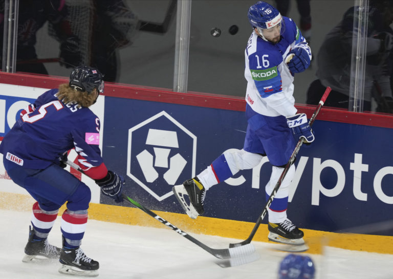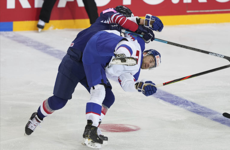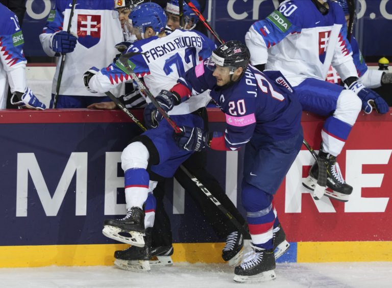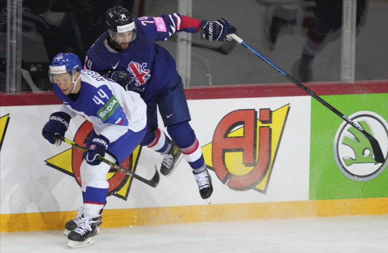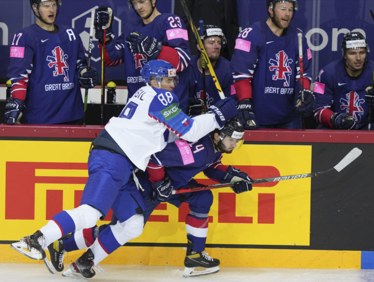 Brit Sam Duggan padá po súboji so slovenským útočníkom Martinom Faškom-Rudášom počas zápasu na MS v hokeji 2021. Riga, 23. máj 2021. Foto: SITA/AP.
