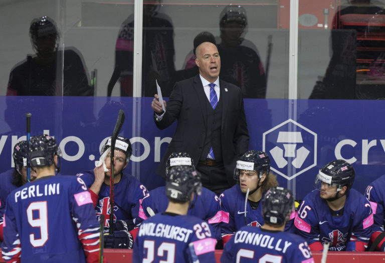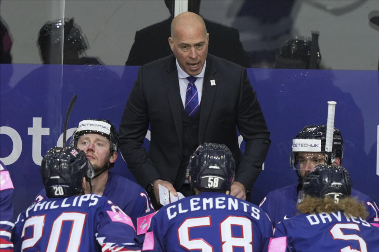 Tréner Veľkej Británie Peter Russell počas zápasu proti Slovensku na MS v hokeji 2021. Riga, 23. máj 2021. Foto: SITA/AP.