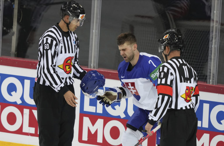 Otrasený slovenský obranca Mário Grman počas zápasu proti Veľkej Británii na MS v hokeji 2021. Riga, 23. máj 2021. Foto: SITA/AP.