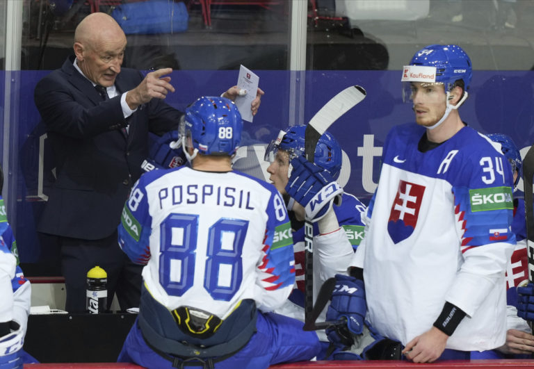 Tréner slovenskej reprezentácia Craig Ramsay počas zápasu proti Veľkej Británii na MS v hokeji 2021. Riga, 23. máj 2021. Foto: archívne SITA/AP.