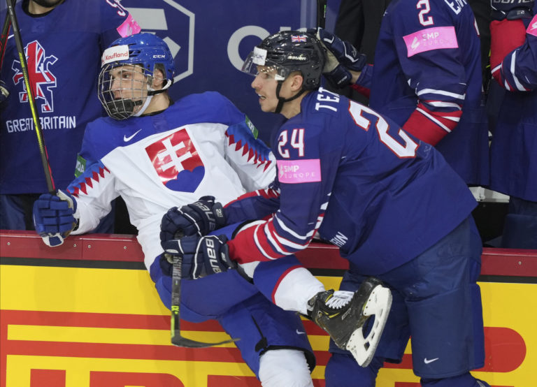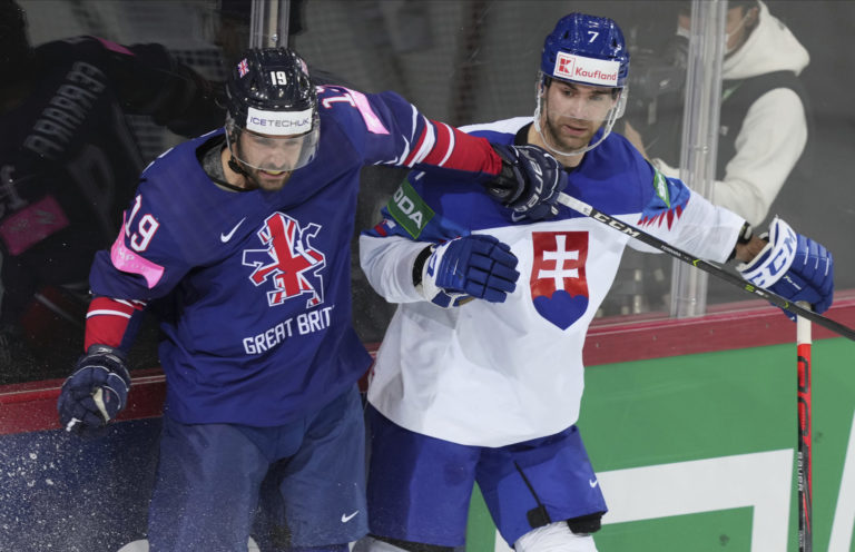 Brit Ben Davies a slovenský útočník Róbert Lantoši počas zápasu na MS v hokeji 2021. Riga, 23. máj 2021. Foto: SITA/AP.