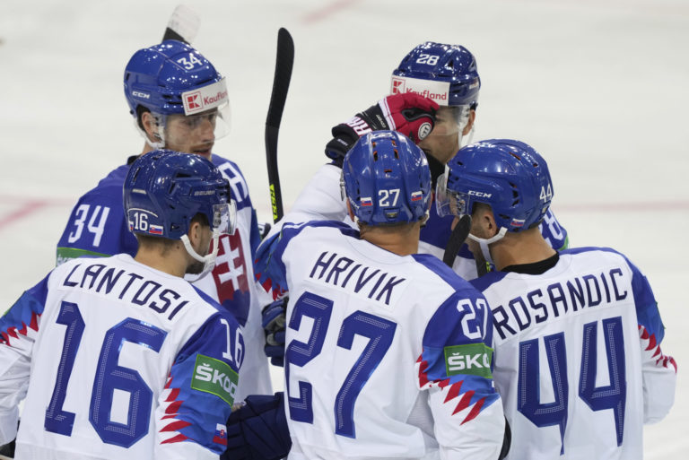 Radosť slovenských reprezentantov po góle v sieti Veľkej Británie počas zápasu na MS v hokeji 2021. Riga, 23. máj 2021. Foto: SITA/AP.