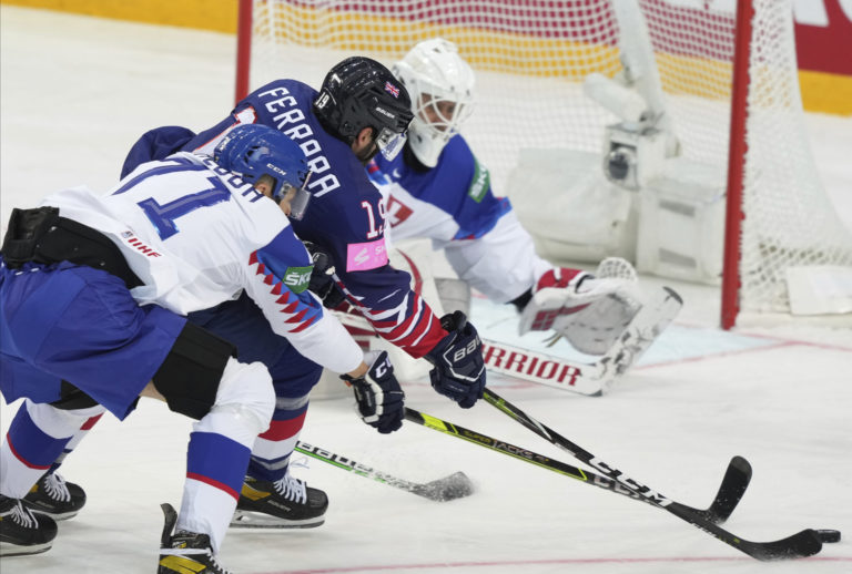 Slovenský útočník Matúš Sukeľ sa snaží prekonať britského gólmana Bena Bownsa počas zápasu na MS v hokeji 2021. Riga, 23. máj 2021. Foto: SITA/AP.