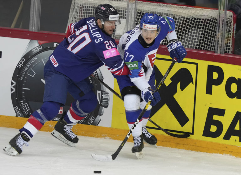 v súboji s Britom Oliverom Betteridgom počas zápasu na MS v hokeji 2021. Riga, 23. máj 2021. Foto: SITA/AP.