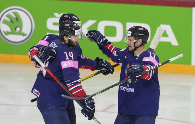 Britský útočník Liam Kirk sa so spoluhráčmi teší zo svojho gólu v sieti Slovenska počas zápasu na MS v hokeji 2021. Riga, 23. máj 2021. Foto: SITA/AP.
