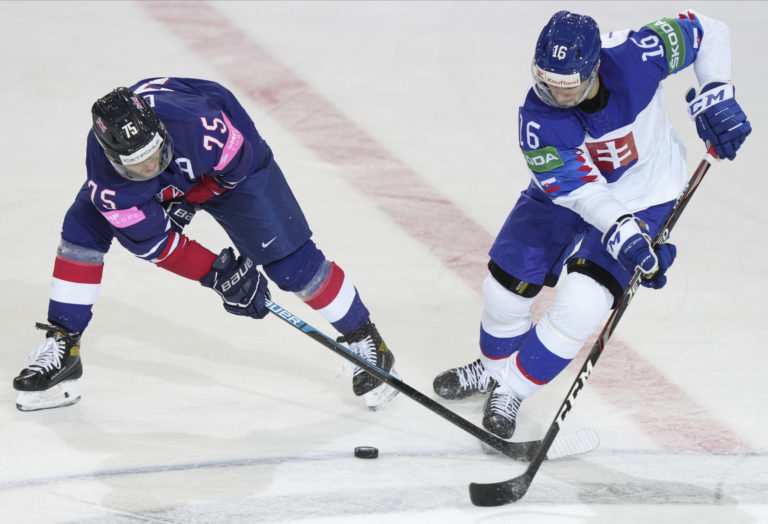 Brit Joshua Tetlow v súboji so slovenským útočníkom Jurajom Slafkovským počas zápasu na MS v hokeji 2021. Riga, 23. máj 2021. Foto: SITA/AP.