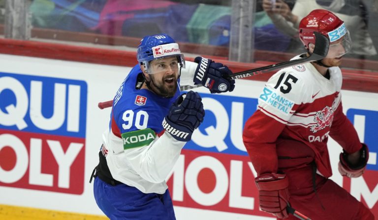 Slovenský útočník Pavol Regenda sa teší zo svojho gólu v sieti Dánska počas zápasu základnej A-skupiny na MS v hokeji 2022. Helsinki (Helsinki Ice Hall), 24. máj 2022. Foto: SITA/AP.