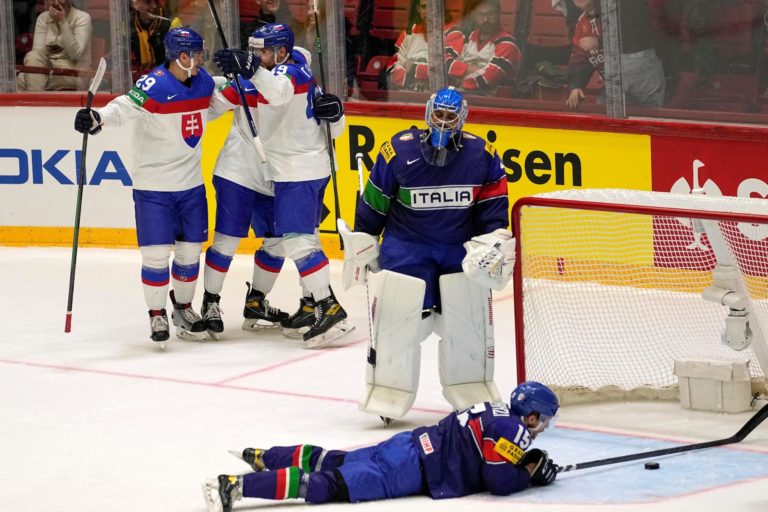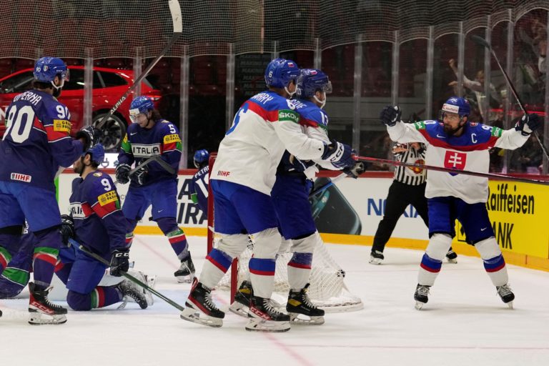 Adam Sýkora zo Slovenska (vľavo) oslavuje svoj gól v bránke Talianska počas zápasu A-skupiny na MS v hokeji vo Fínsku. Helsinki, 21. máj 2022. Foto: SITA/AP