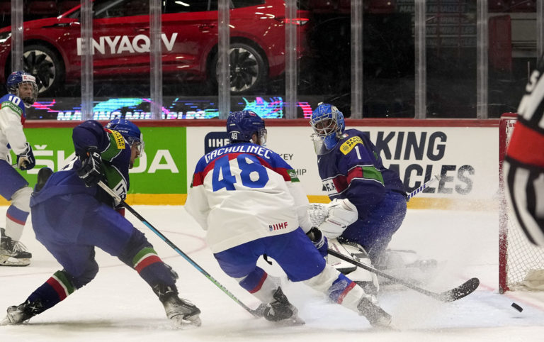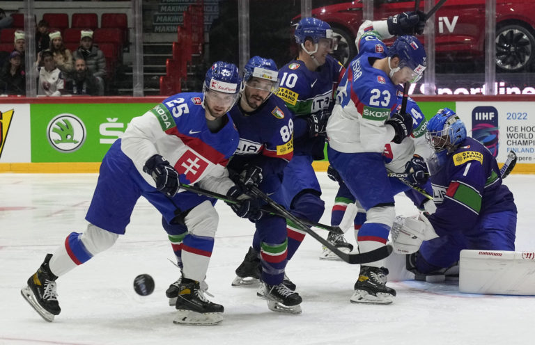 Daniel Gachulinec zo Slovenska (48) sleduje puk, ktorý strelil do bránky Talianska jeho spoluhráč Adam Sýkora (vľavo) počas zápasu A-skupiny na MS v hokeji vo Fínsku. Helsinki, 21. máj 2022. Foto: SITA/AP