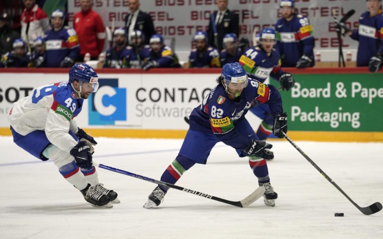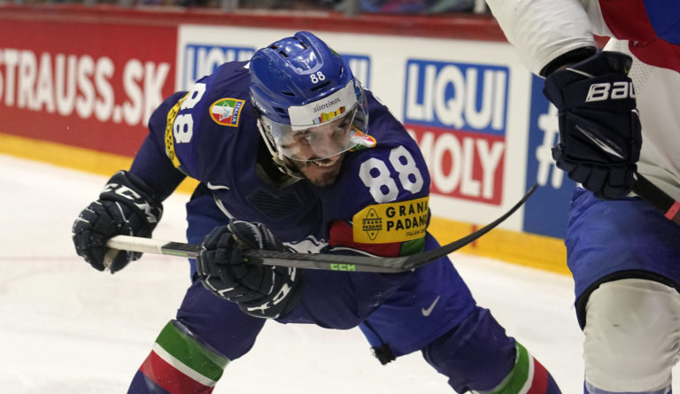 Tommaso Traversa z Talianska počas zápasu A-skupiny na MS v hokeji vo Fínsku proti Slovensku. Helsinki, 21. máj 2022. Foto: SITA/AP