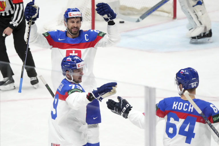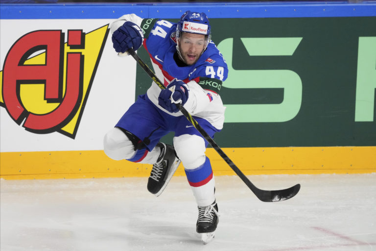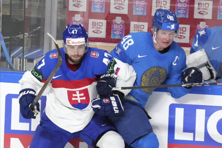 Slovenský obranca Mislav Rosandič počas zápasu proti Kazachstanu v základnej B-skupine na MS v hokeji 2023. Riga (Arena Riga), 19. máj 2023. Foto: SITA/AP.