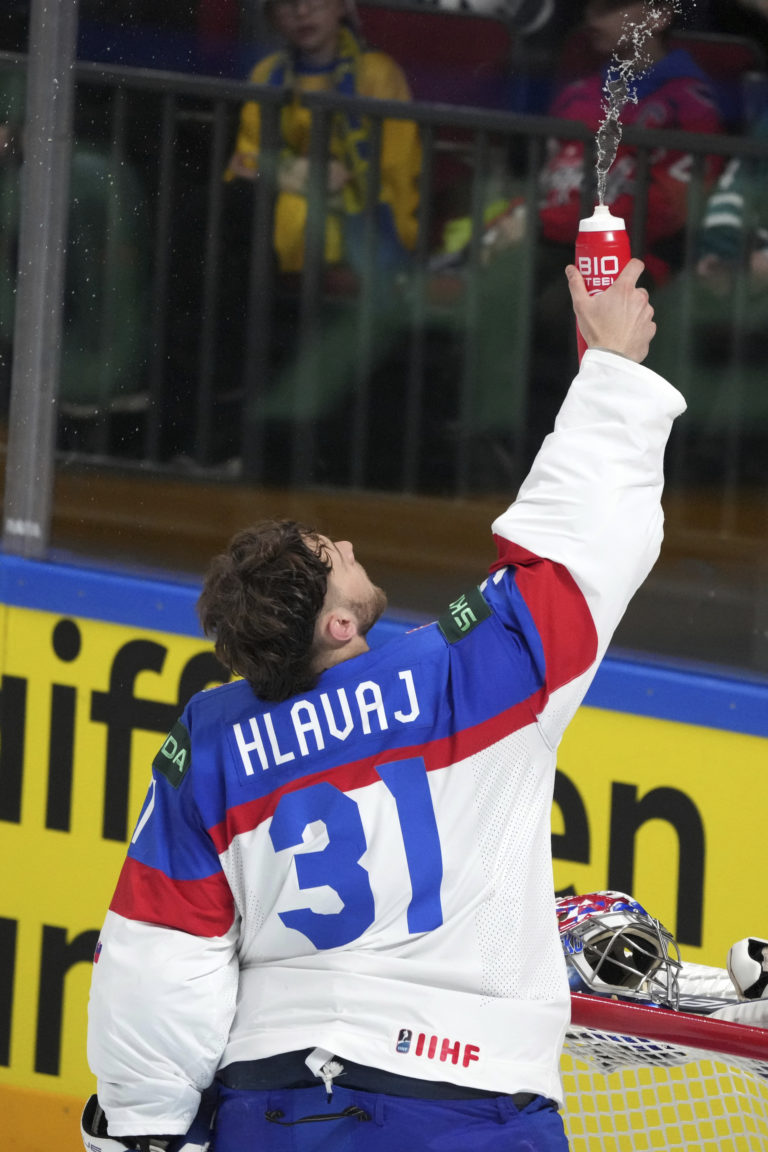 Slovenský gólman Samuel Hlavaj pred zápasom proti Kazachstanu v základnej B-skupine na MS v hokeji 2023. Riga (Arena Riga), 19. máj 2023. Foto: SITA/AP.