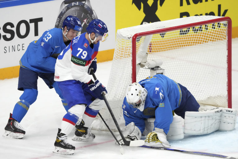 Zákrok kazašského brankára Andreja Šutova v zápase proti Slovensku v základnej B-skupine na MS v hokeji 2023. Riga (Arena Riga), 19. máj 2023. Foto: SITA/AP.