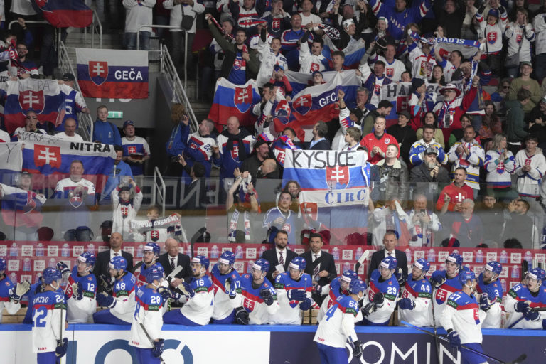 Fanúšikovia počas zápasu Kazachstan - Slovensko v základnej B-skupine na MS v hokeji 2023. Riga (Arena Riga), 19. máj 2023. Foto: SITA/AP.