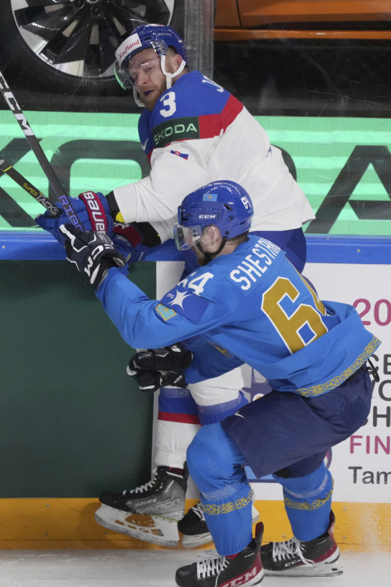 Slovenský obranca Adam Jánošík v súboji s Kazachom Arkadiom Šestakovom v zápase základnej B-skupiny na MS v hokeji 2023. Riga (Arena Riga), 19. máj 2023. Foto: SITA/AP.