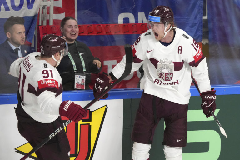 Rodrigo Abols (vpravo) a Ronalds Kenins z Lotyšska oslavujú gól počas zápasu skupiny B medzi Slovenskom a Lotyšskom na majstrovstvách sveta v ľadovom hokeji v lotyšskej Rige v sobotu 13. mája 2023. Foto: SITA/AP (Roman Koksarov)