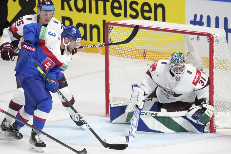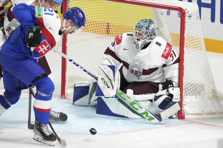 Matúš Sukel (vpravo) bojuje o puk s brankárom Artursom Silovsom z Lotyšska počas zápasu skupiny B medzi Slovenskom a Lotyšskom na majstrovstvách sveta v ľadovom hokeji v lotyšskej Rige v sobotu 13. mája 2023. Foto: SITA/AP (Roman Koksarov)