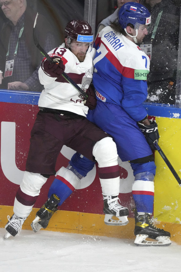 Slovák Mario Grman (vpravo) bojuje o puk s Lotyšom Rihardsom Bukartsom počas zápasu skupiny B medzi Slovenskom a Lotyšskom na majstrovstvách sveta v ľadovom hokeji v lotyšskej Rige v sobotu 13. mája 2023. Foto: SITA/AP (Roman Koksarov)