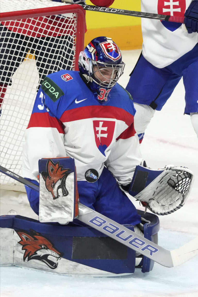 Zákrok slovenského brankára Stanislava Škorvánka v zápase proti Nórsku v základnej B-skupine na MS v hokeji 2023. Riga (Arena Riga), 23. máj 2023. Foto: SITA/AP.