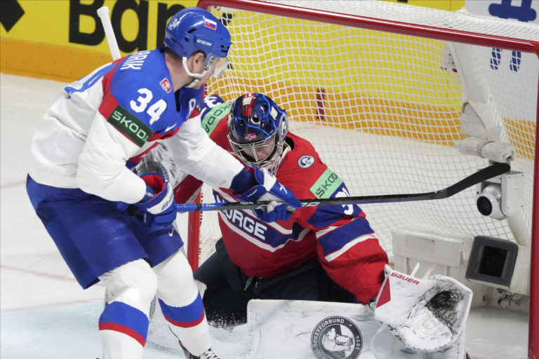 Slovenský útočník Marek Hrivík prekonáva nórskeho brankára Henrika Haukelanda v zápase základnej B-skupiny na MS v hokeji 2023. Riga (Arena Riga), 23. máj 2023. Foto: SITA/AP.