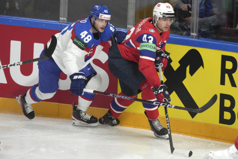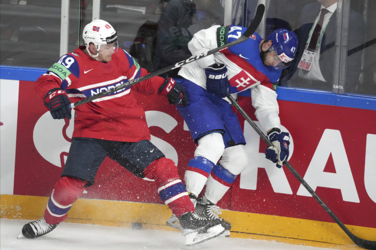 Slovenský útočník Viliam Čacho v súboji s Nórom Maxom Krogdahlom v zápase základnej B-skupiny na MS v hokeji 2023. Riga (Arena Riga), 23. máj 2023. Foto: SITA/AP.