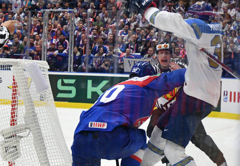 Andrej Kudrna zo a Nikita Michajlis počas zápasu Slovensko - Kazachstan v základnej B-skupine na MS v hokeji 2024. Ostrava (Ostravar Aréne), 12. máj 2024. Foto: SITA/Martin Medňanský.