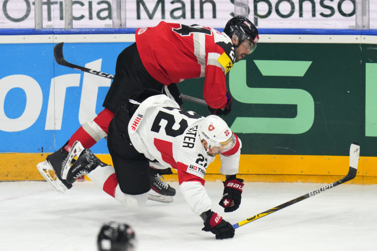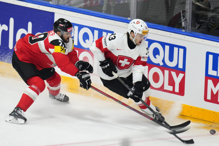 Súboj rakúskeho obrancu Stevena Stronga a švajčiarskeho útočníka Nina Niederreitera v zápase základnej A-skupiny na MS v hokeji 2024. Praha (O2 Arena), 12. máj 2024. Foto: SITA/AP.