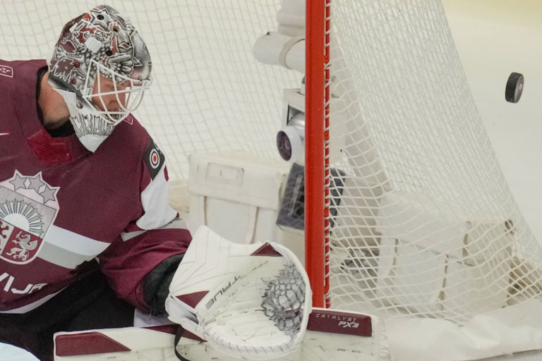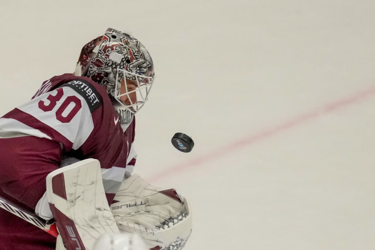 Zákrok lotyšského gólmana Elvisa Merzlikinša počas zápasu proti Francúzsku v B-skupine na MS v hokeji 2024. Ostrava (Ostravar Aréne), 12. máj 2024. Foto: SITA/AP.