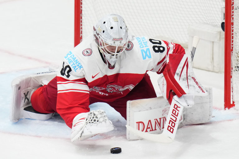 Zákrok dánskeho gólmana Frederika Dichowa počas zápasu proti Kanade v základnej A-skupine na MS v hokeji 2024. Praha (O2 Arena), 12. máj 2024. Foto: SITA/AP.