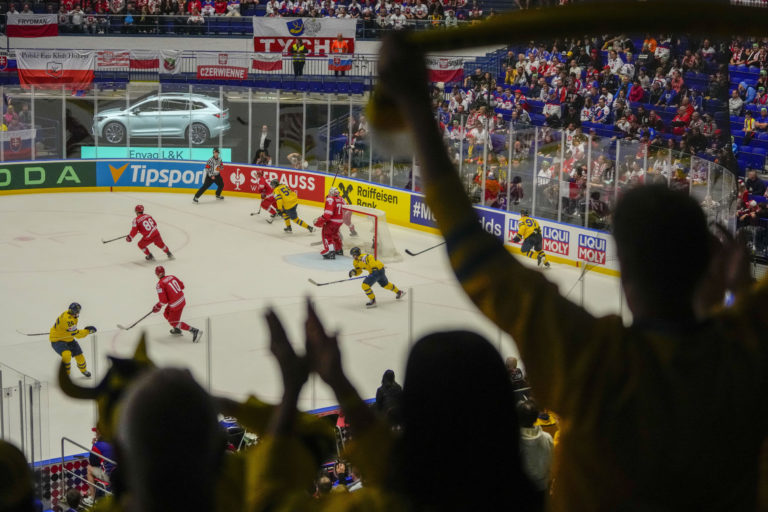 Fanúšikovia počas zápasu Švédsko - Poľsko v základnej B-skupine na MS v hokeji 2024. Ostrava (Ostravar Aréna), 12. máj 2024. Foto: SITA/AP.