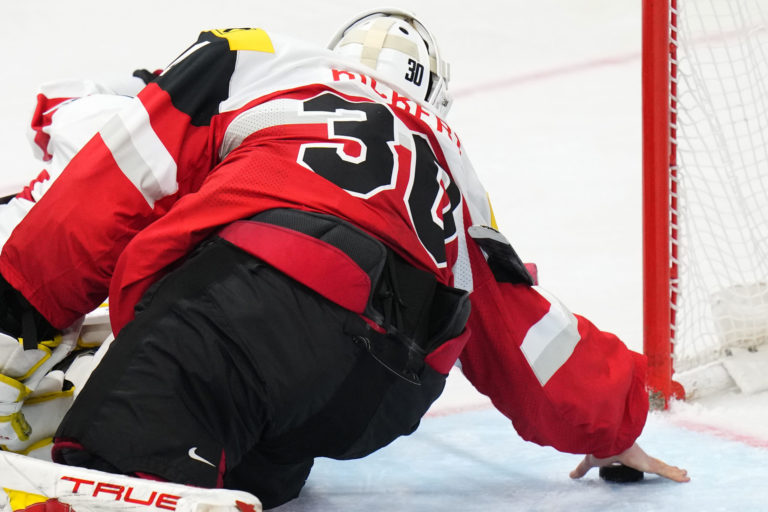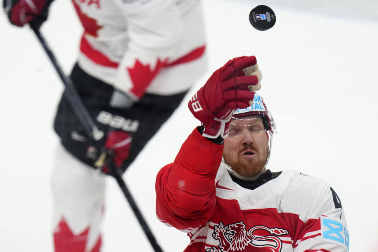 Dán Phillip Bruggisser sa snaží zachytiť puk počas zápasu proti Kanade v základnej A-skupine na MS v hokeji 2024. Praha (O2 Arena), 12. máj 2024. Foto: SITA/AP.