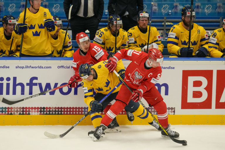 Poľský útočník Alan Lyszczarczyk padá po súboji so Švédom Victorom Olofssonom počas zápasu základnej B-skupiny na MS v hokeji 2024. Ostrava (Ostravar Aréna), 12. máj 2024. Foto: SITA/AP.