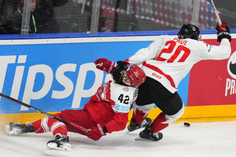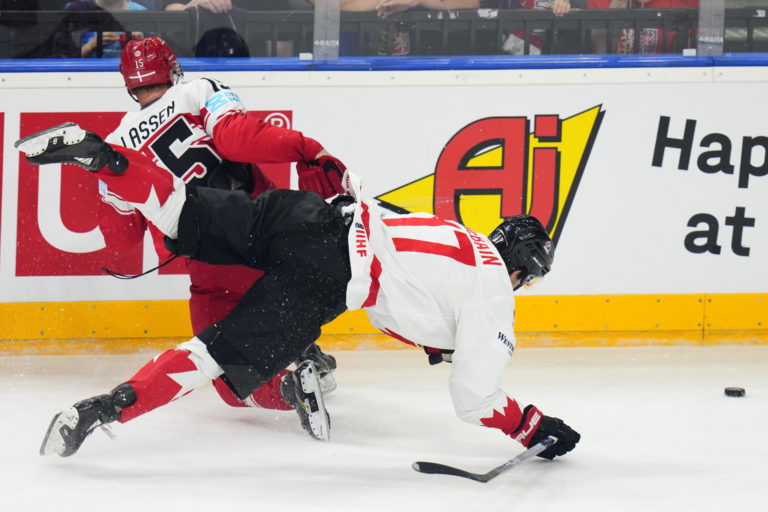 Dán Phillip Bruggisser padá po súboji s kanadským útočníkom Nickom Paulom počas zápasu základnej A-skupiny na MS v hokeji 2024. Praha (O2 Arena), 12. máj 2024. Foto: SITA/AP.