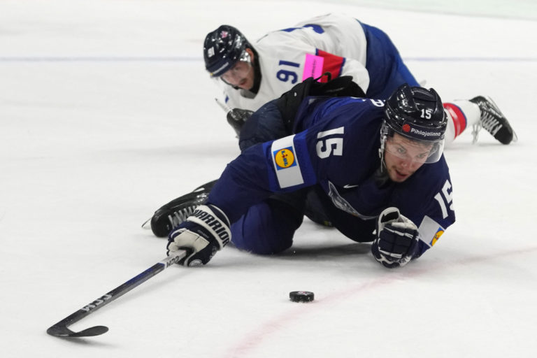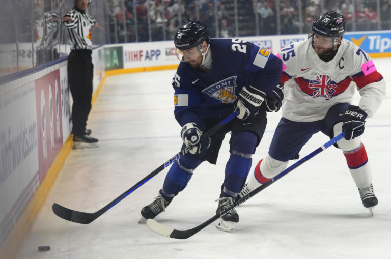 Britský hokejista Robert Dowd (vpravo) počas súboja o puk s fínskym hráčom Pekkom Jormakkaom počas zápasu základnej A-skupiny na MS v hokeji 2024. Praha (O2 Arena), 10. máj 2024. Foto: SITA/AP.
