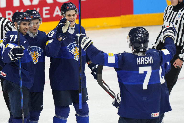 Fínsky hokejista Jesse Puljujarvi (vpravo) sa teší so svojimi spoluhráčmi zo streleného gólu do britskej brány počas zápasu základnej A-skupiny na MS v hokeji 2024. Praha (O2 Arena), 10. máj 2024. Foto. SITA/AP.