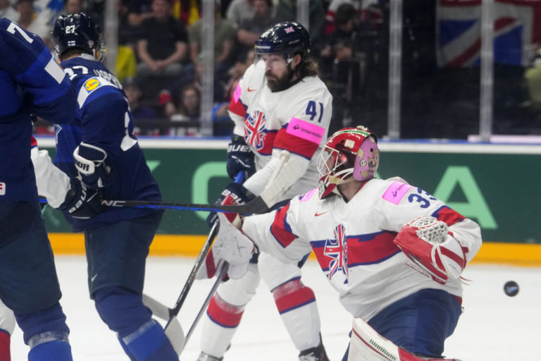 Fínsky hokejista Oliver Kapanen (vľavo) skóroval do brány Britov počas zápasu základnej A-skupiny na MS v hokeji 2024. Praha (O2 Arena), 10. máj 2024. Foto: SITA/AP.