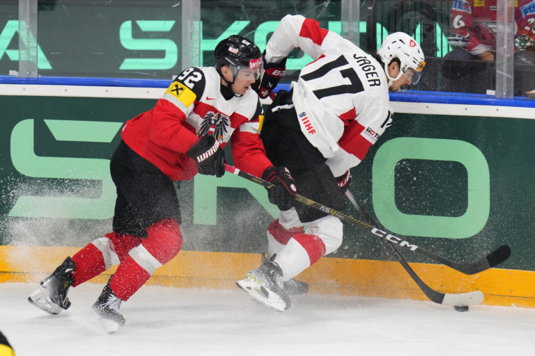 Rakúsky útočník Clemens Unterweger v súboji so Švajčiarom Kenom Jägerom v zápase základnej A-skupiny na MS v hokeji 2024. Praha (O2 Arena), 12. máj 2024. Foto: SITA/AP.