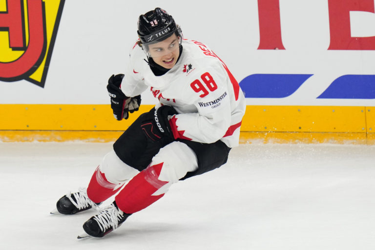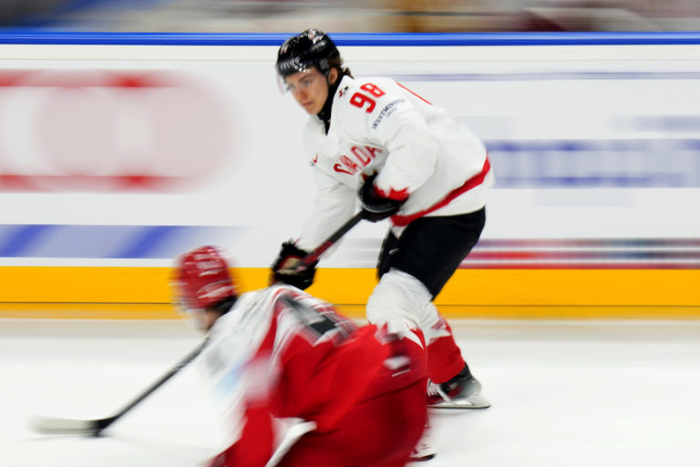 Kanadský talent Connor Bedard počas zápasu proti Dánsku v základnej A-skupine na MS v hokeji 2024. Praha (O2 Arena), 12. máj 2024: Foto: SITA/AP.
