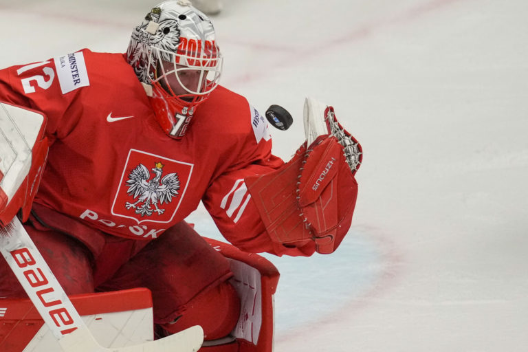 Zákrok poľského gólmana Davida Zabolotného počas zápasu proti Švédsku v základnej B-skupine na MS v hokeji 2024. Ostrava (Ostravar Aréna), 12. máj 2024. Foto: SITA/AP.