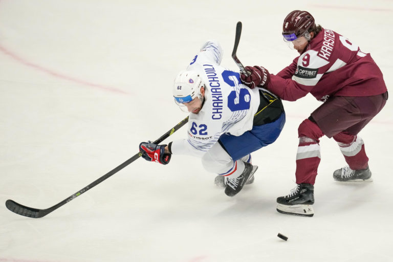 Francúz Florian Chakiachvili a Lotyš Renars Krastenbergs v súboji o puk počas zápasu základnej B-skupiny na MS v hokeji 2024. Ostrava (Ostravar Aréna), 12. máj 2024. Foto: SITA/AP.