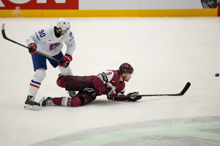 Lotyš Renars Krastenbergs padá po súboji s Francúzom Aurelienom Dairom počas zápasu základnej B-skupiny na MS v hokeji 2024. Ostrava (Ostravar Aréna), 12. máj 2024. Foto: SITA/AP.