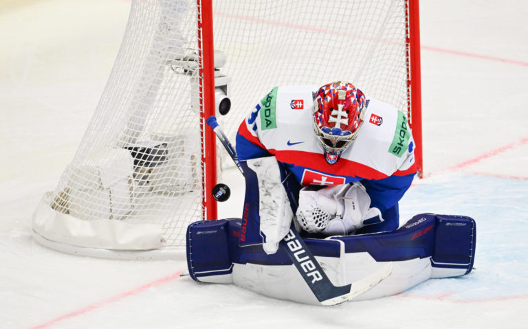 Zákrok slovenského brankára Samuela Hlavaja počas zápasu proti USA v základnej B-skupiny na MS v hokeji 2024. Ostrava (Ostravar Aréna), 13. máj 2024. Foto: SITA/Martin Medňanský.