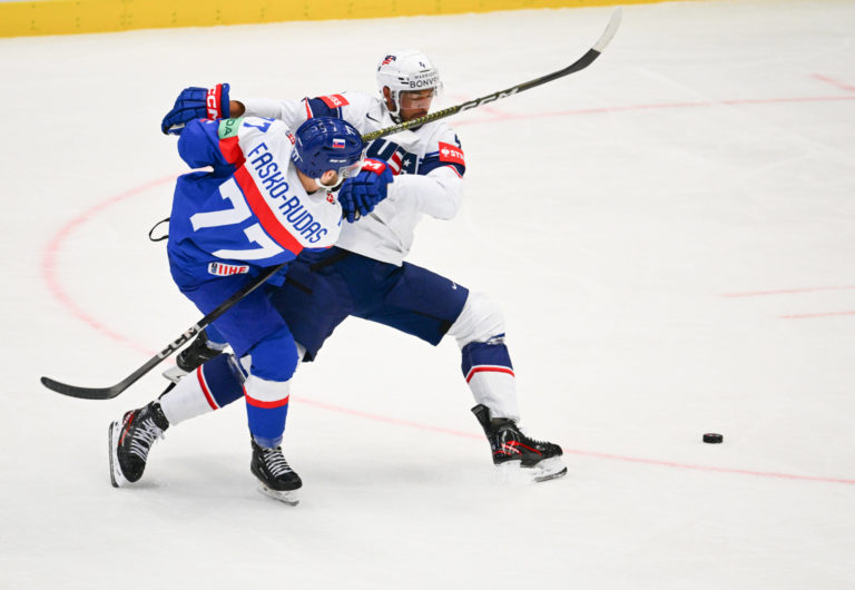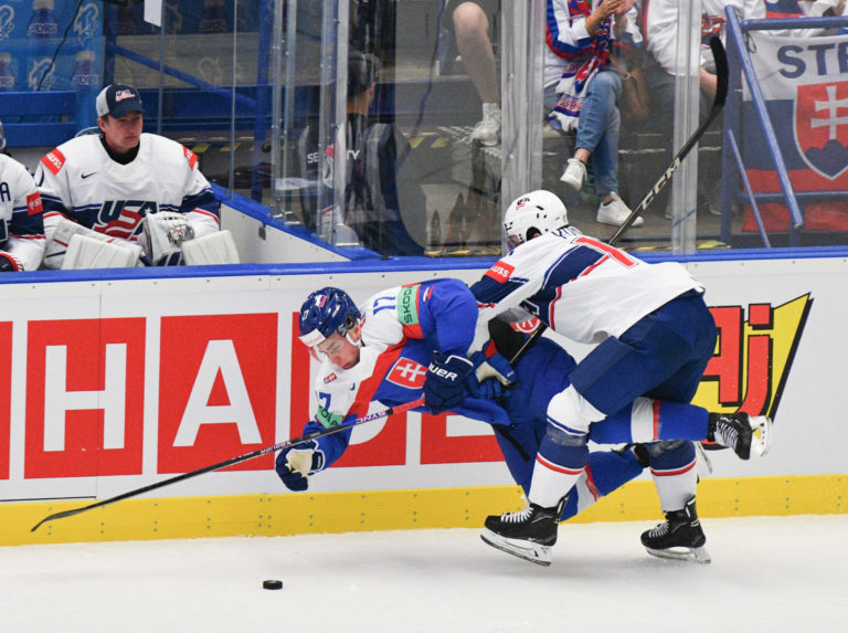 Slovenský obranca Šimon Nemec padá po súboji s Američanom Lukeom Kuninom počas zápasu základnej B-skupiny na MS v hokeji 2024. Ostrava (Ostravar Aréna), 13. máj 2024. Foto: SITA/Martin Medňanský.