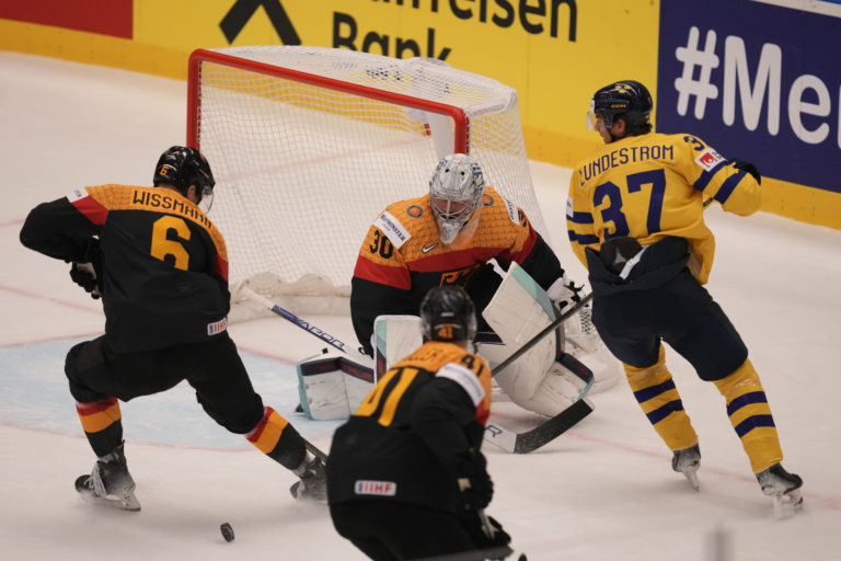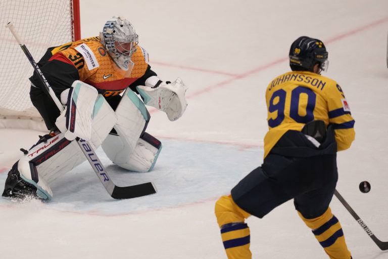 Brankár Nemecka Philipp Grubauer (vľavo) v akcii počas zápasu základnej B-skupiny proti Švédsku na MS v hokeji 2024. Ostrava (Ostravar Aréna), 13. máj 2024. Foto: SITA/AP