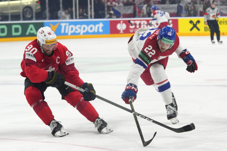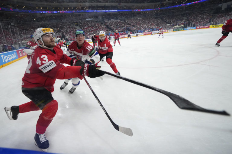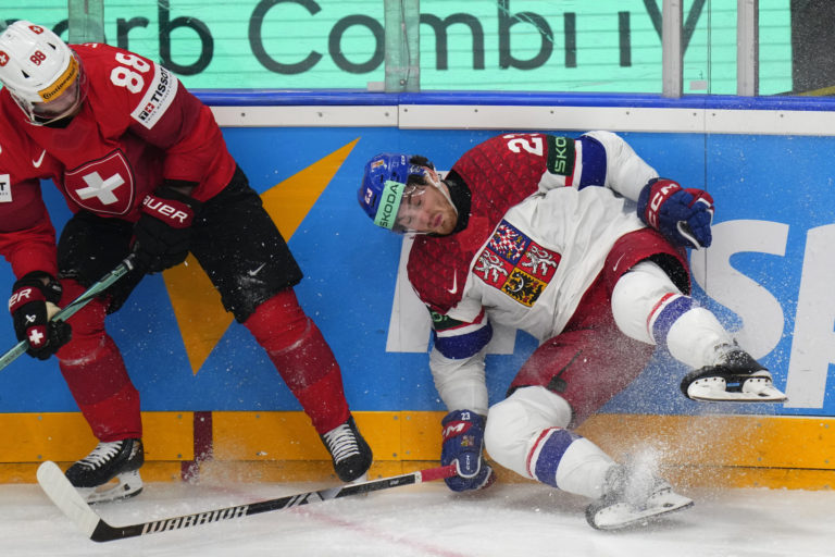 Lukáš Sedlák z Česka (vpravo) padá po súboji pri mantineli s Christophom Bertschym zo Švajčiarska počas zápasu základnej A-skupiny na MS v hokeji 2024. Praha (O2 Arena), 13. máj 2024. Foto: SITA/AP