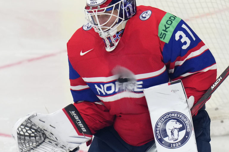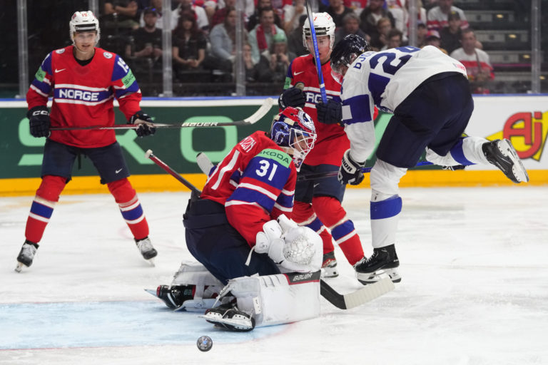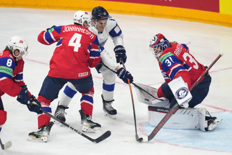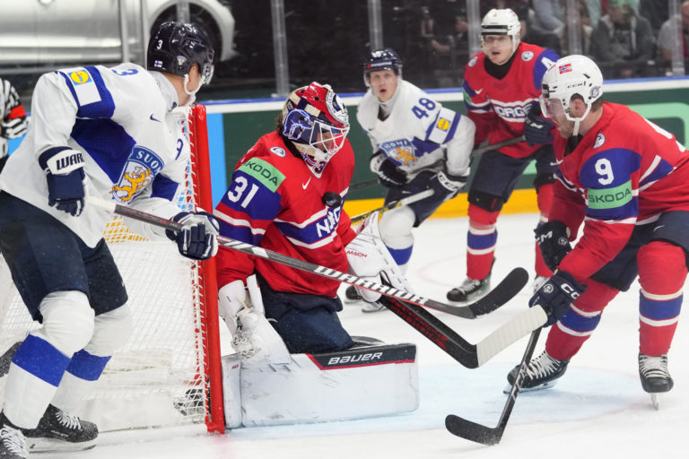 Brankár Nórska Jonas Arntzen zasahuje počas zápasu základnej A-skupiny proti Fínsku na MS v hokeji 2024. Praha (O2 Arena), 13. máj 2024. Foto: SITA/AP