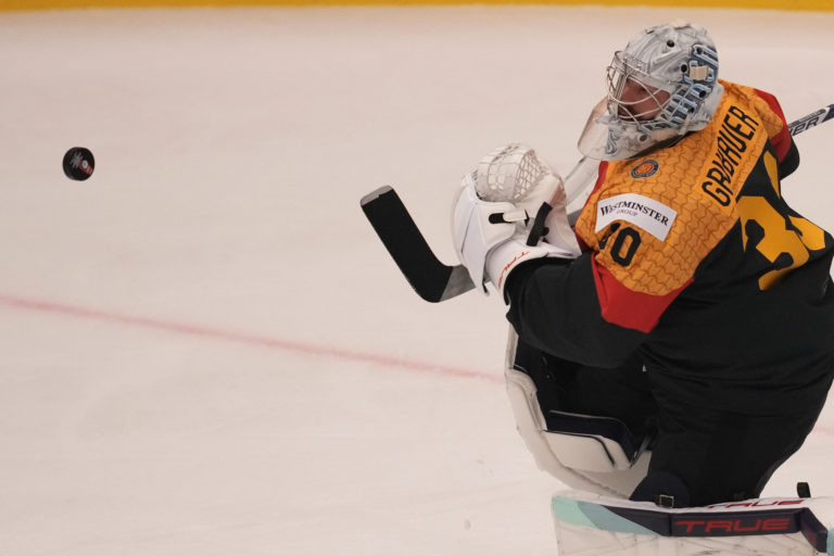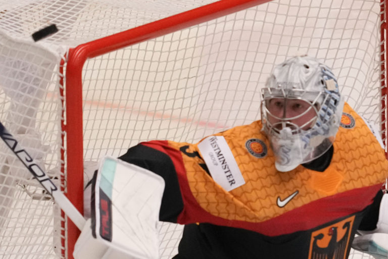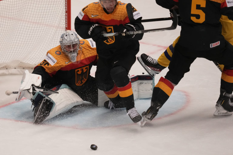 Brankár Nemecka Philipp Grubauer zasahuje počas zápasu základnej B-skupiny proti Švédsku na MS v hokeji 2024. Ostrava (Ostravar Aréna), 13. máj 2024. Foto: SITA/AP